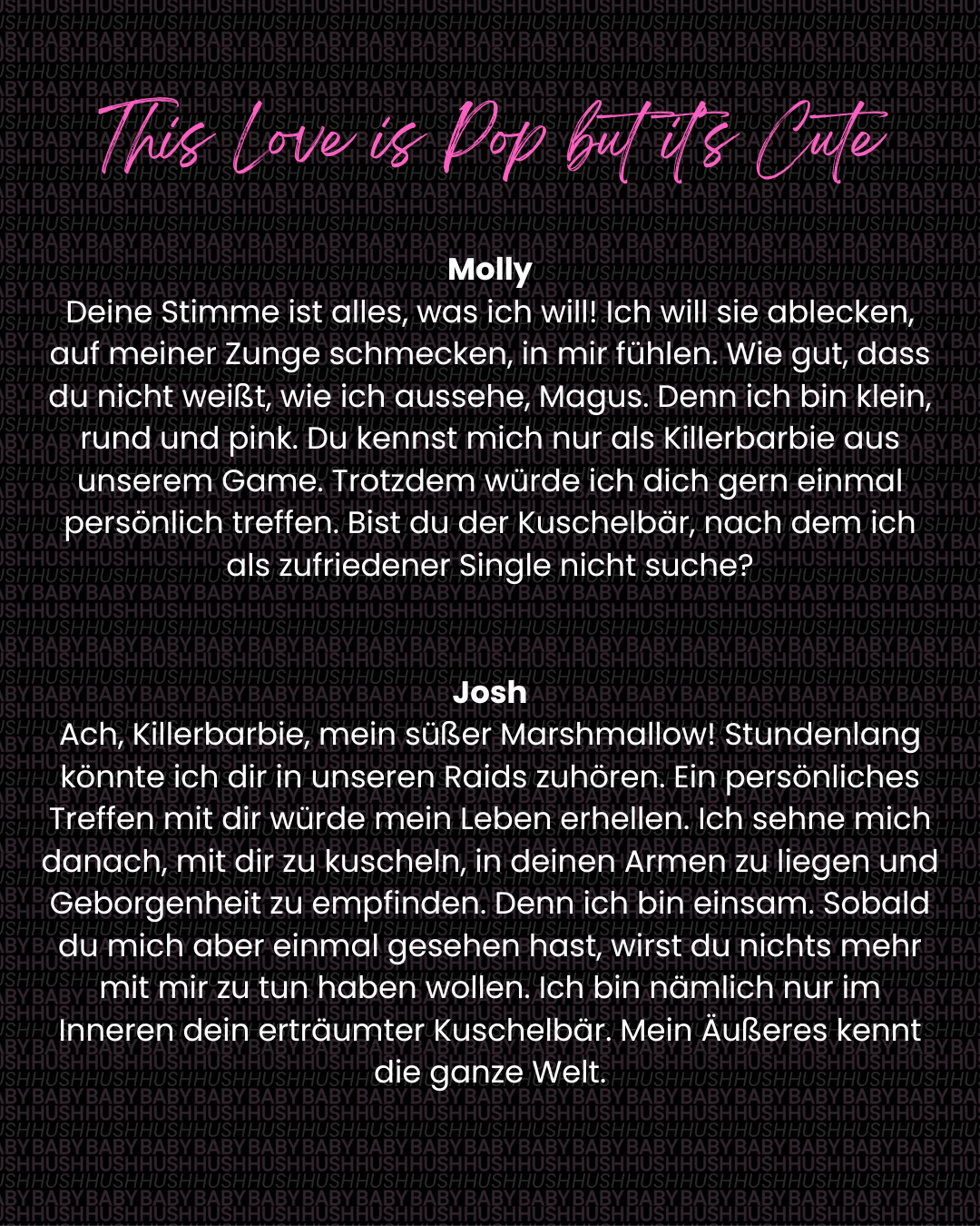 Hush Hush Baby, die international erfolgreiche Boygroup, kehrt nach einer langen Pause endlich wieder auf die Bühne zurück. Die Teenager von damals sind erwachsen geworden, doch Molly gewinnt den Männern nichts ab. Ihr Herz schlägt für den Magier aus ihrem Online-Spiel Windsong of Warcry.